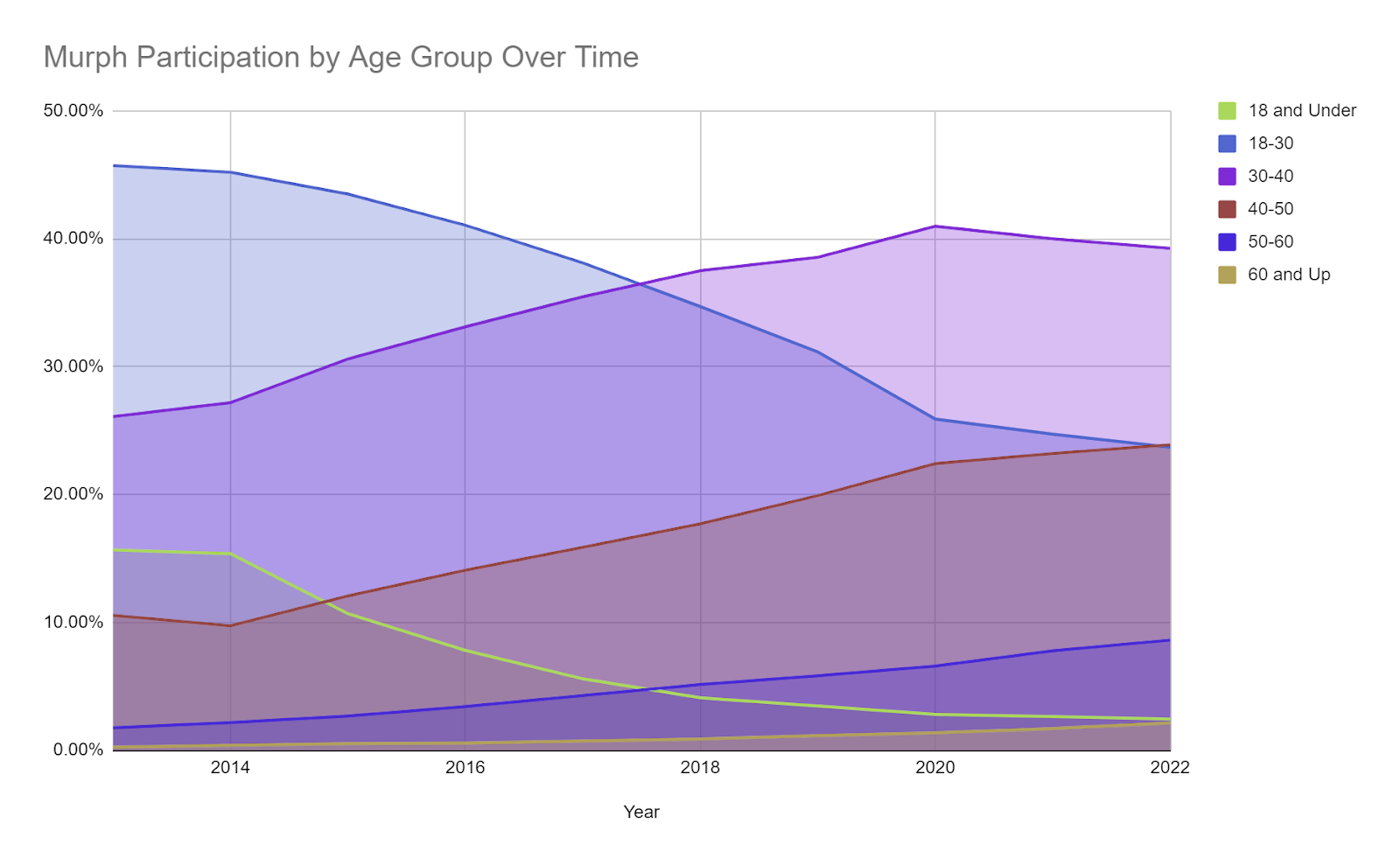 Data shows that in 2022 and 2023, the age group with the highest percentage of people logging and completing Murph results is between the ages of 30-40.