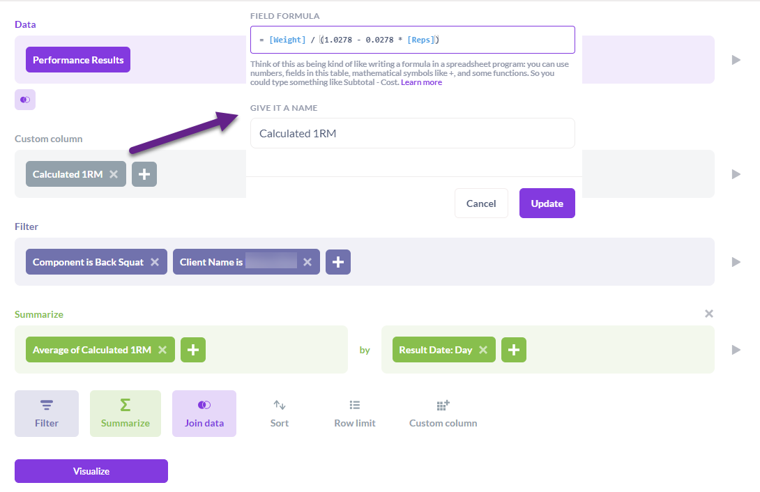 - Create a custom column called “Calculated 1RM (1-rep max)” (this column will use the Brzycki formula to estimate 1-rep maximums for every back squat recorded for the given client)