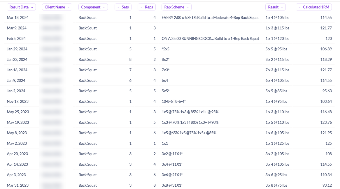 - Filter for “Back Squat” as the “Component” and select a “Client Name” to view one client’s results
