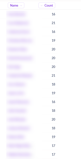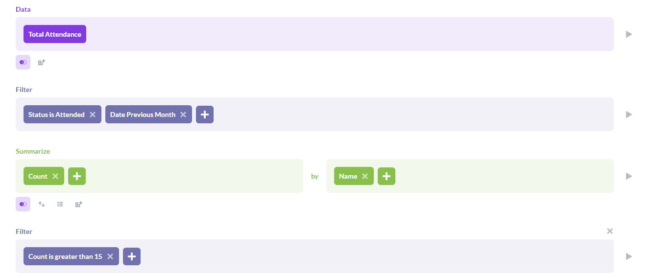 - Choose “Count” as the summarization (this will count the number of rows, i.e. attendances) and then group by “Name” (this will give total attendances for each client)