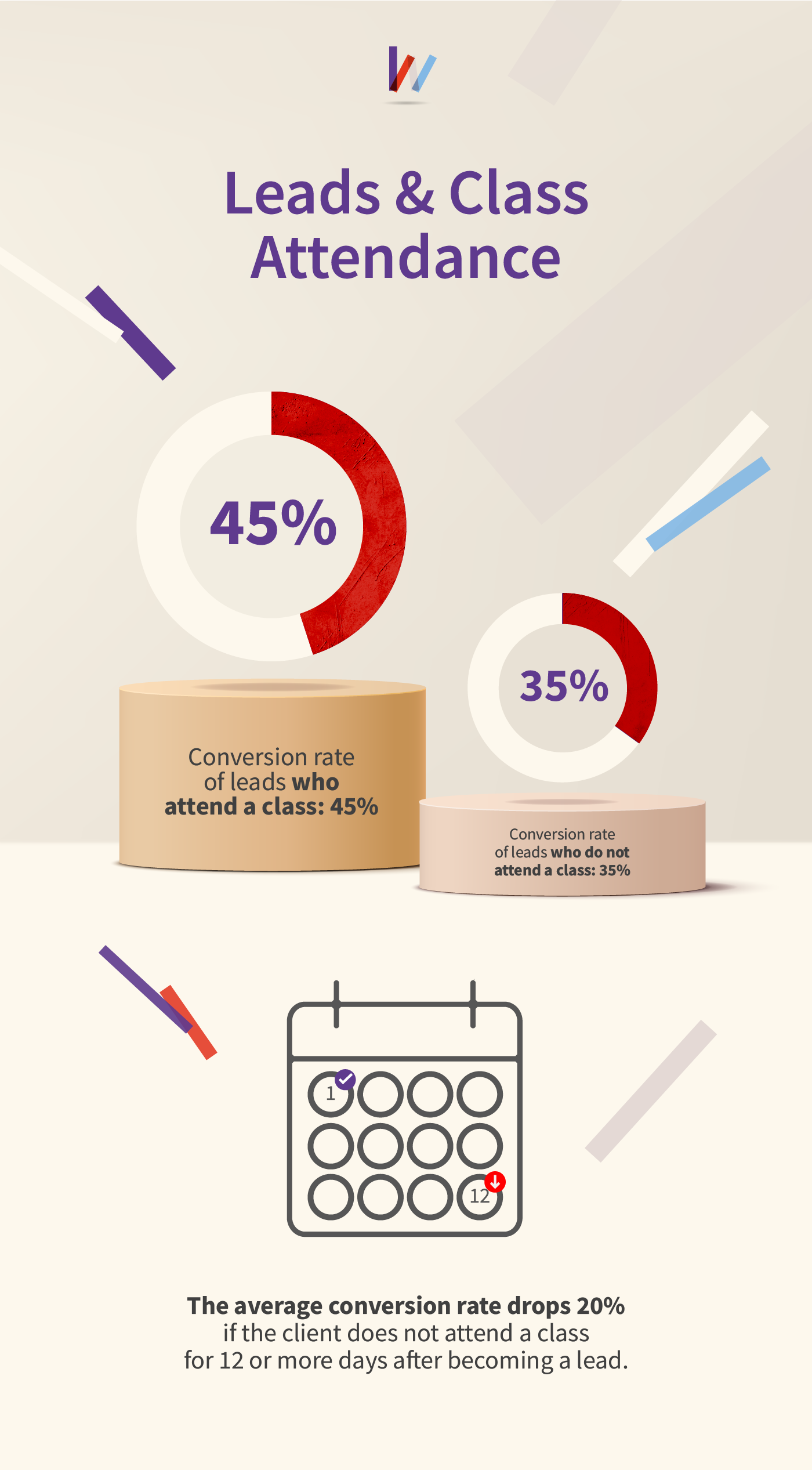 Since 2021, there was a 5% increase in the likelihood into a customer if they attended a class within the first 12 days of becoming a lead. This highlights the importance of having leads attend a class as soon as possible, especially with so many online options these days!