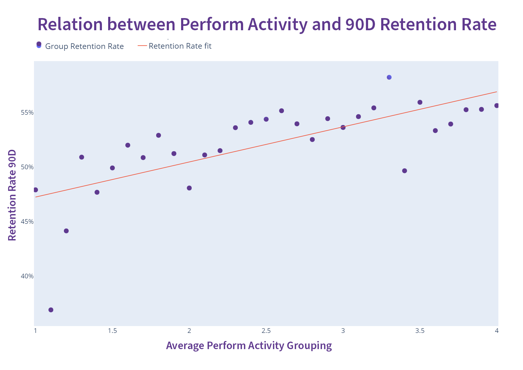 The graph below shows that the more active clients are with their performance tracking (average perform activity grouping), the higher the 90 day retention rate will be.