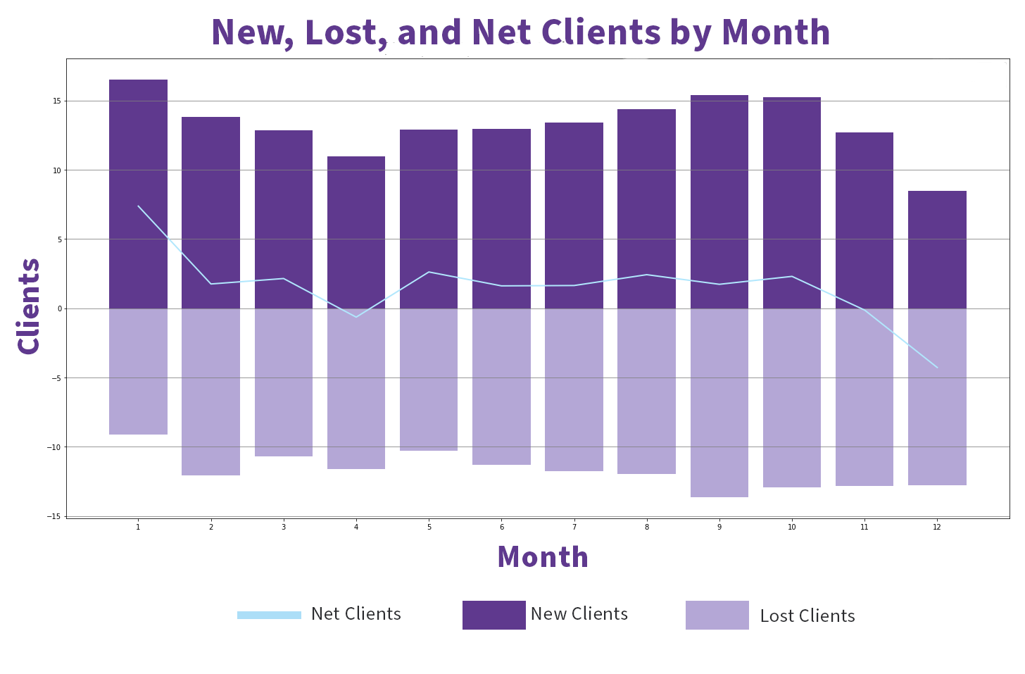 The graph below shows new, lost, and net clients by month with data from the US, Canada, UK, Australia, and New Zealand over the past 6 years.