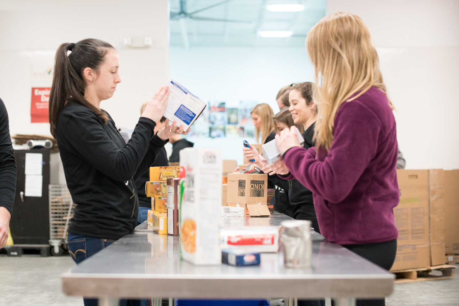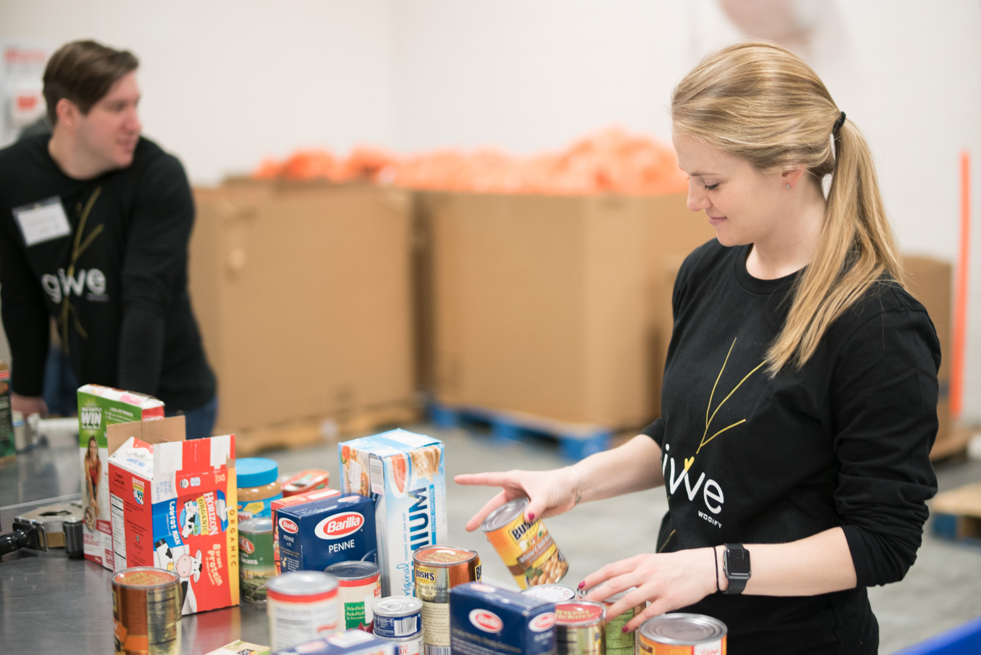 At the Food Bank’s distribution center, our team was tasked with sorting and organizing food as well as packing meals for some of the Food Bank’s programs. Our team’s knack for teamwork and ambitious nature kicked in, and we were off to the races. Splitting up into small teams, assigning each other tasks and working together, we were able to effectively accomplish the objectives at hand. In the Wodify spirit, we spiced things up with a little friendly competition and our duties quickly evolved into team races to see who could make the best boxes and pack the most meals.
