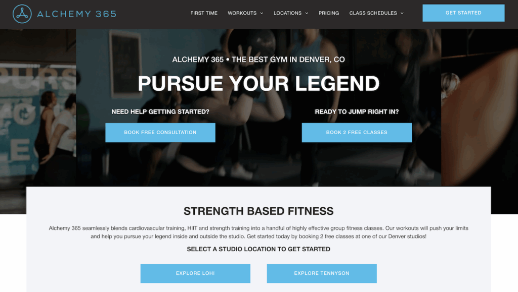 The clear “Book 2 Free Classes” CTA is a strong offer that removes the friction of conversion from website visitors into leads, then gets new leads into Alchemy 365 quickly.