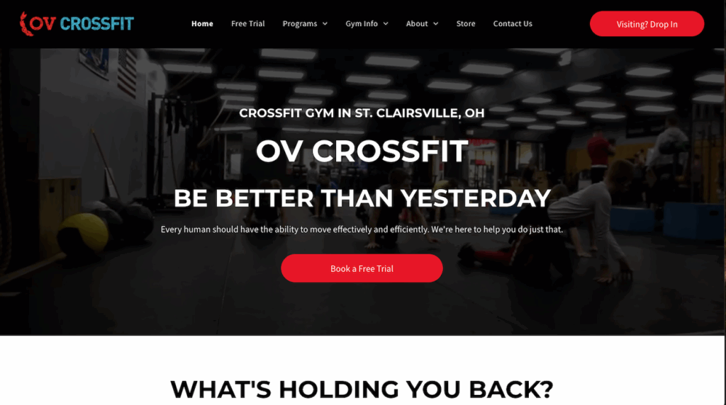 OV CrossFit opens with a strong headline message, “Be Better Than Yesterday”, and an immediate “Book a Free Trial” call to action. The homepage also explains a simple three-step journey for joining the gym: 1) Claim Your Free Trial → 2) Go Through Onboarding → 3) Sign Up. Below it, the site features the daily class schedule right on the homepage—zero guesswork for a new CrossFitter who might otherwise be intimated by the idea of joining a CrossFit gym.