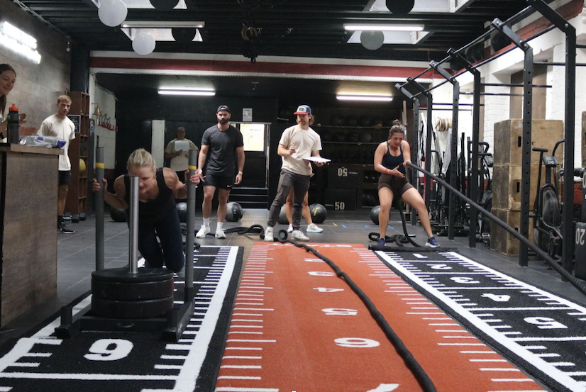 We picked a sled weight between the standard sled push and pull weights, and left the sleds loaded at that weight. We also modified the sled stations to be first, and had a ‘Push/Pull’ and ‘Pull/Push’ station. By making these changes, we didn’t need to have volunteers ready to change plates, or hook and unhook ropes on our sleds throughout the event. This was the main deviation we made from the standard HYROX race format, but it worked incredibly well.