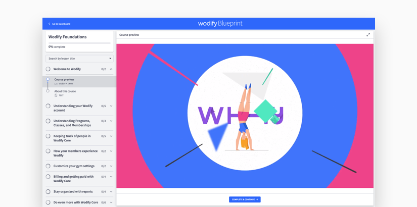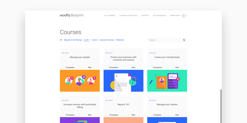 Wodify Blueprint is a set online courses and webinars that any gym owner can take to get the most out of their investment. Each one is free and can be completed or reviewed at any time, in any order. On average, course completion runs between 45-60 minutes, with webinars lasting about 30 minutes. The goal of Wodify Blueprint is to help gym owners become more familiar with the terminology and permissible actions inside their Wodify Core account, so they can save time and take full advantage of its helpful features.